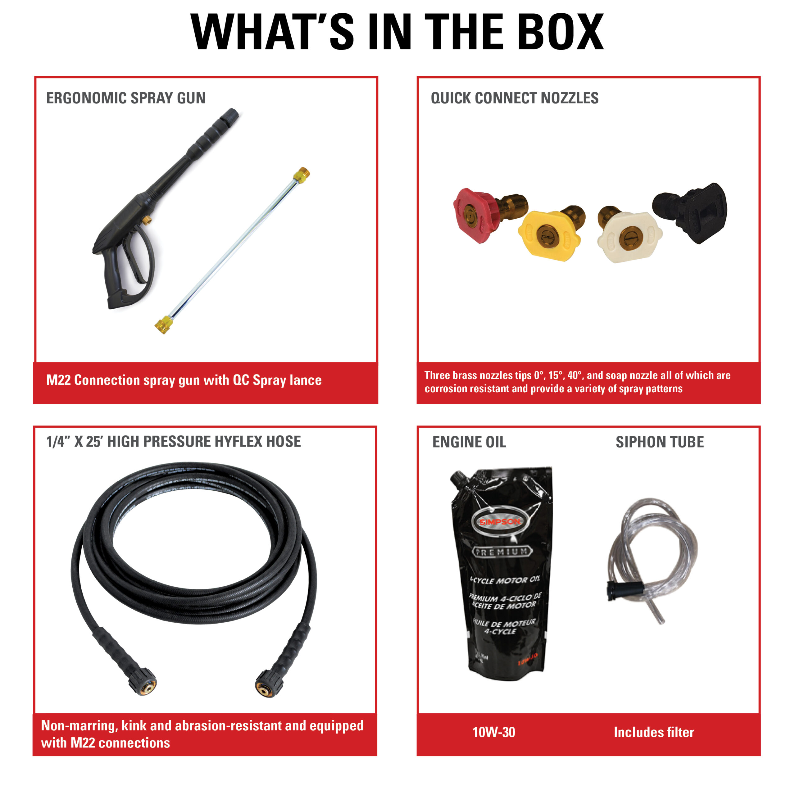- 4 Quick connect nozzle tips: 0°,15°, 40°, and soap to use for a variety of cleaning applications