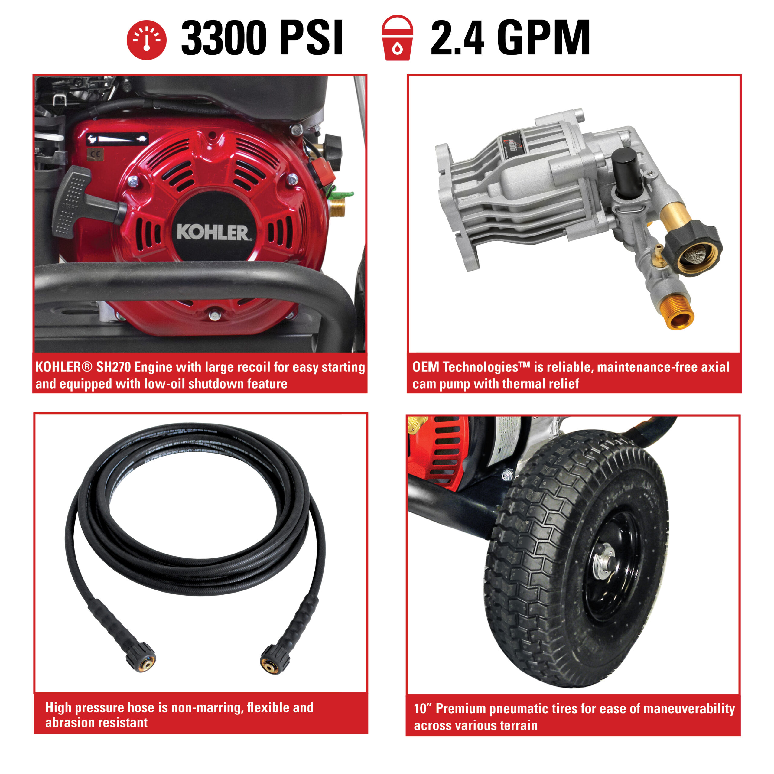 Clean big with the Clean Machine® by SIMPSON®! This fully assembled compact gas pressure washer is lightweight, easy to store, and provides a powerful pressure washing experience. Just set up and you are ready to clean. The Clean Machine features a (50-State compliant) KOHLER® SH Series engine paired with an OEM Technologies™ axial cam pump. This compact gas-pressure washer will allow easy access to hard-to-clean areas.